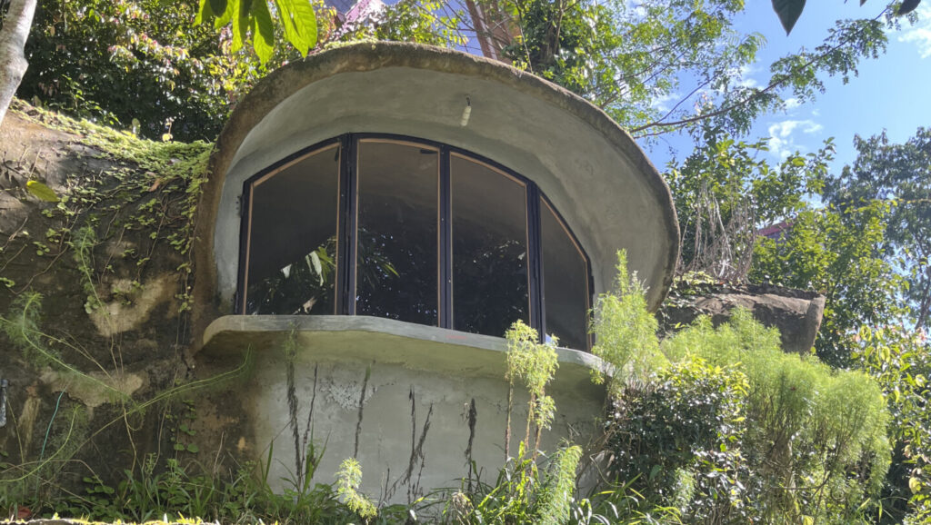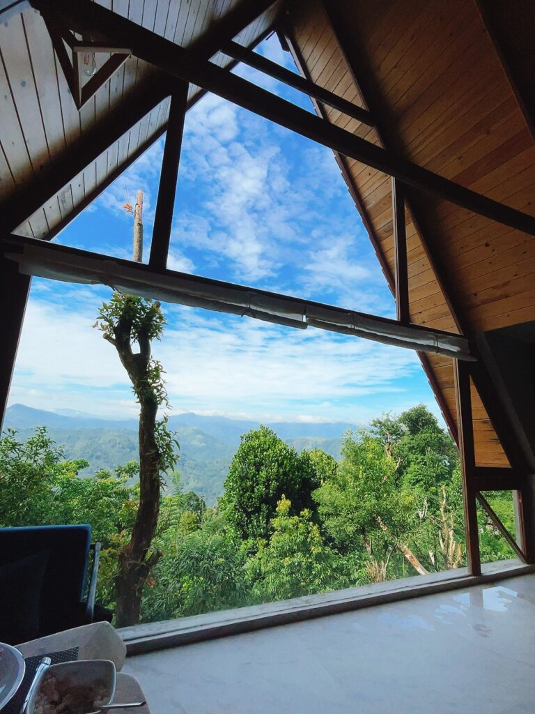 お部屋の大きな三角形のガラス越しに緑豊かな山々が見えます。窓の外をリスが追いかけっこしたり。