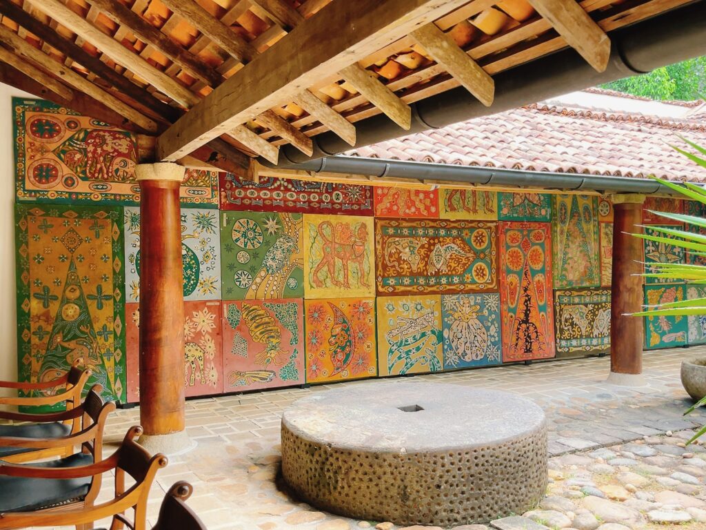シナモンベントタビーチのホテルロビーには、エナ・デ・シルワのバティックの作品が一面に貼られた天井があります。